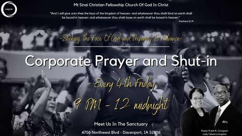 - Every 4th Friday of the month 9:00p -12p PRAYER & SHUT-IN